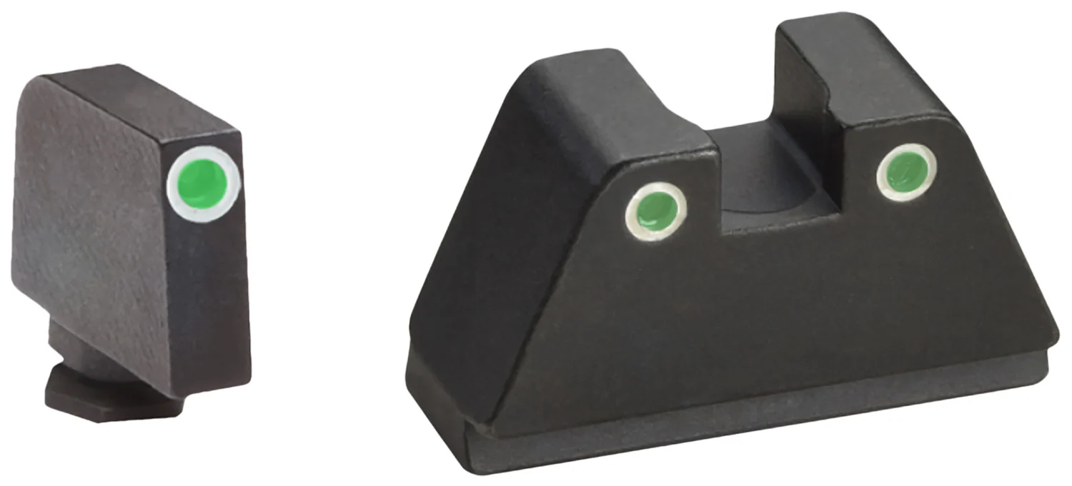 AmeriGlo brings a clear advantage to your shooting experience on and off the range. AmeriGlo Optic Compatible Sight sets provide a precise, elevated co-witness sight picture for slide-mounted red dot optics and suppressors and serve as reliable back-up sights. This XL Tall model has a green tritium front sight with white outline and green tritium rear sight with white outline and black finish. It is compatible with all Glock Gen 1-5 models except: 42,43,43X & 48. Fits Glock MOS slide. Compatible with Aimpoint Acro, Holosun 509T, Steiner MPS footprints.