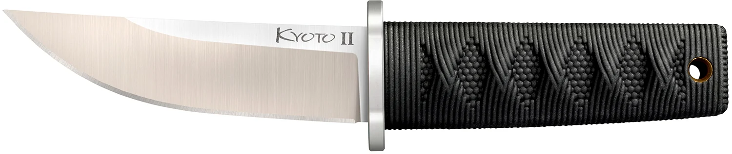 Small fixed blades like our Kyoto offer astounding cutting and thrusting potential that belies their modest stature. The robustly stout blades have wide, full tangs that run the full length of the handle. They are coupled with stainless steel guards and super high traction Kray-Ex handles that are stylized to mimic the traditional look of cord wrapped Japanese sword handles. The slim, comfortable sheath is versatile and will accept a bead chain lanyard or a Cold Steel C-Clip, so it can be carried in a variety of ways.