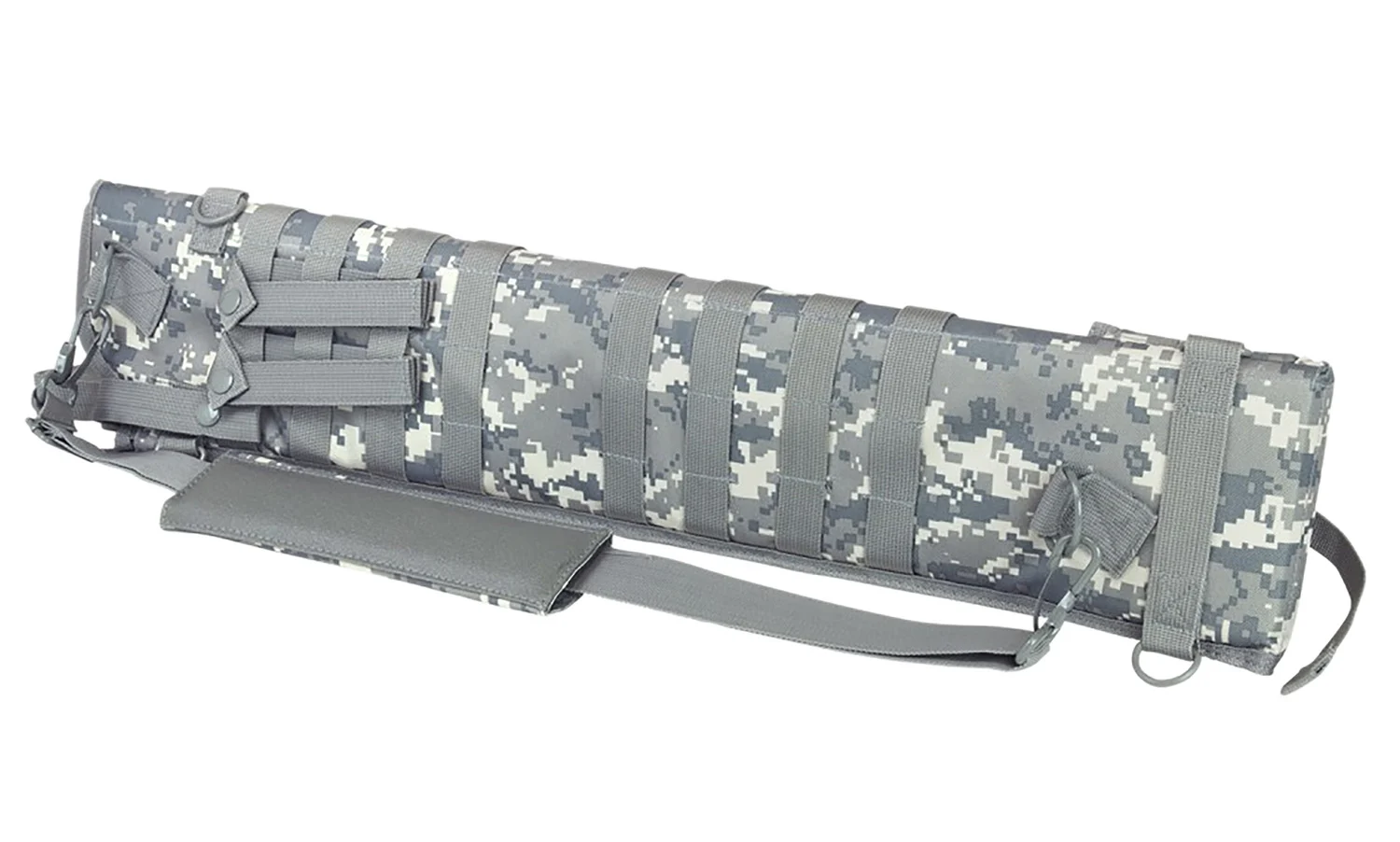 The NcStar Tactical Shotgun Scabbard is designed for shoulder carry or modular mounting. The webbing on both sides with four detachable PALS straps are for ambidextrous use. There are six D-ring locations for attaching the padded shoulder sling for multiple carry options or preferences.