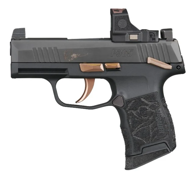 Sig Sauer, MFG# 365-380-ROSE-MS-RS, UPC: 798681729975, UOM: EA, P365 Rose Kit, .380 ACP, 3.1″ Barrel, OR, Romeo-RS Compact, Rose Engraved Grip, Black, (2) 10-rd , SIGA, SIGAHG10, SIGAHGALL, HG10, HGALL