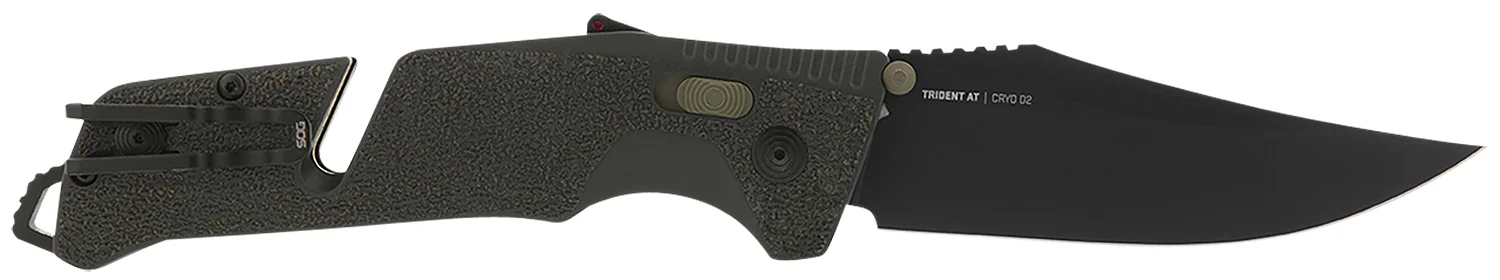 A folding knife designed for professional users, Trident AT features rapid assisted opening with SOG’s innovative ambidextrous AT-XR Lock, as well as integrated line cutter and glass breaker. Trident AT is easy to carry, with a highly functional 3.75″ cryogenically heat-treated D2 stainless steel blade. Its powerful AT-XR locking mechanism also features built-in blade locking safety and spine-mounted safety system. Features lanyard loop, line cutter, glass breaker.