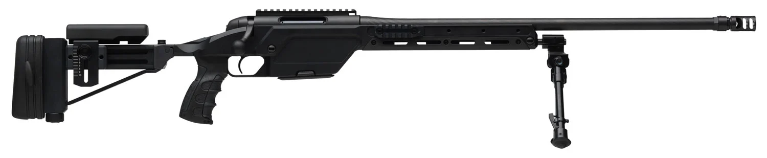 The Steyr SSG 08 is a high-precision, high-performance rifle that was designed to the specifications of Austria’s EKO COBRA anti-terrorism unit and developed for professional applications in demanding environments. Each SSG 08 is built on a system that includes a folding hard Eloxal-coated aircraft-aluminum stock with an adjustable rear monopod, a cheek piece that is vertically and horizontally adjustable, and a recoil pad that is horizontally adjusted by adding and removing spacers and vertically adjusted by sliding the pad itself up and down. The pistol grip is configurable with a choice of interchangeable back straps to adjust for hand size and optimized grip. The action is topped with a 20-MOA Picatinny rail, while the forend allows for short Picatinny rails on both sides. The underside of the stock also houses a UIT rail for the addition of accessories such as a handstop. A newly designed bi-pod is included, and the entire platform is in a black finish.