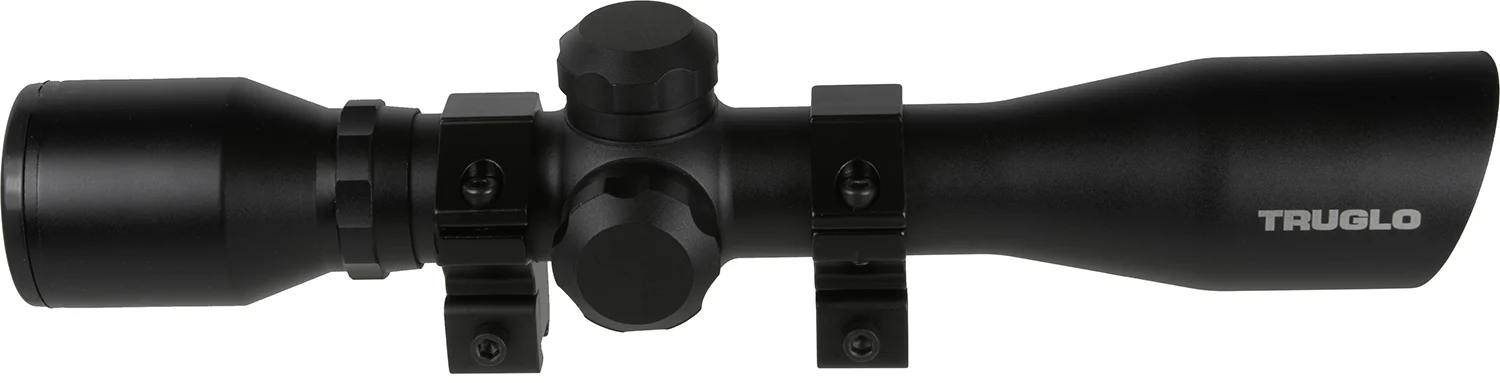 TruGlo’s Compact 4×32 scope has fully coated lenses to provide maximum brightness, clarity and contrast. It has a rubber eye guard and a generous 5.5″ eye relief. Fingertip windage and elevation adjustment are under screw down caps and use durable leaf springs. The one-piece tube is made of aircraft quality aluminum with a durable, scratch resistant, non-reflective matte finish. Includes batteries, 3/8″ rings for .22 and air rifles.
