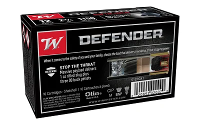 The 12-gauge PDX1 Defender ammunition features a distinctive black hull, black oxide high-base head and 3 pellets of Grex buffered 00 plated buckshot nested on top of a 1 oz rifled slug. The result is the ideal, tight patterning personal defense load. The slug/buckshot combination provides optimum performance at short and long ranges.